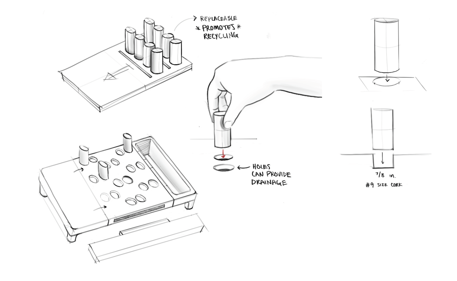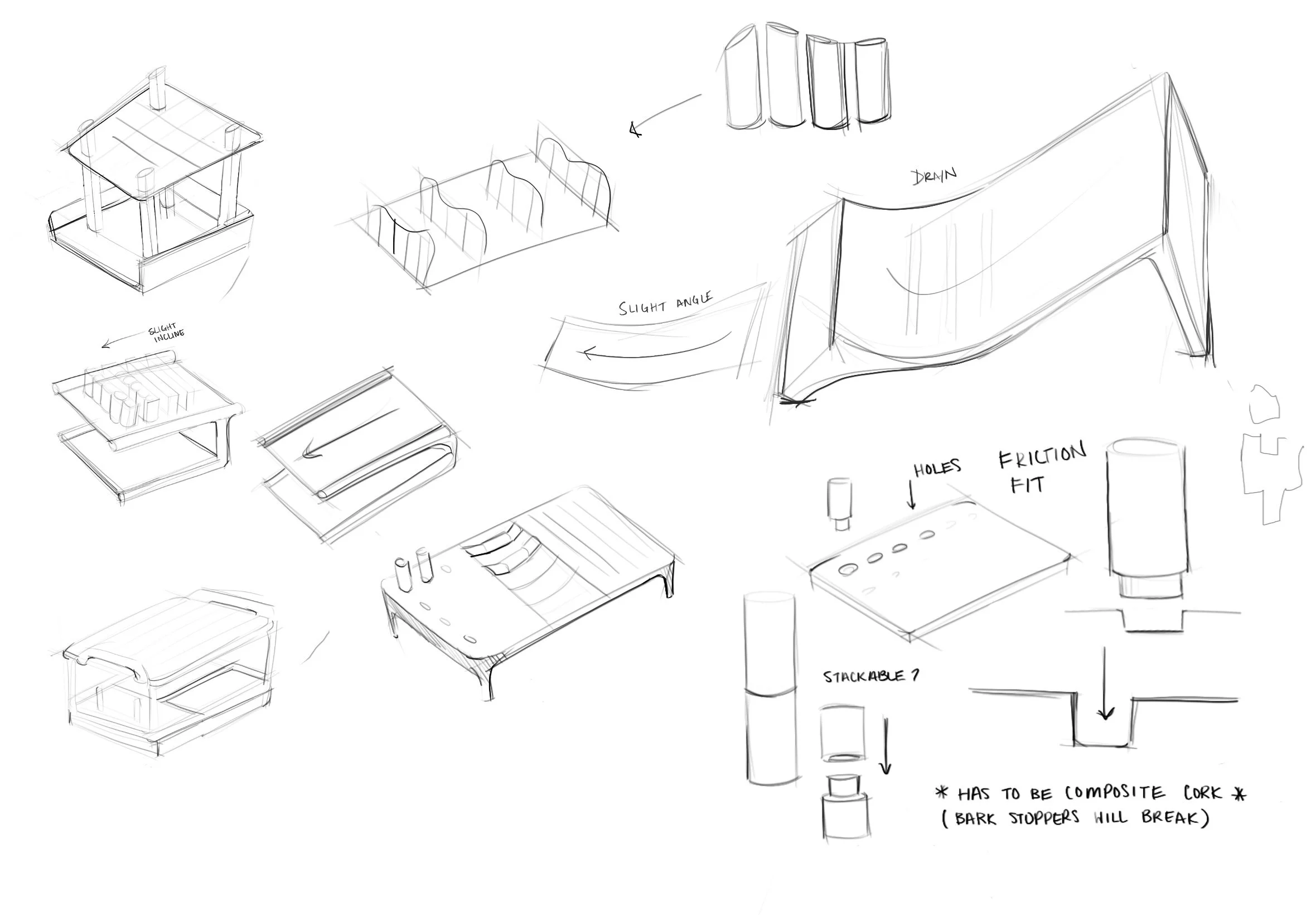 Ideation sketches based on a chosen property of cork - water resistance.